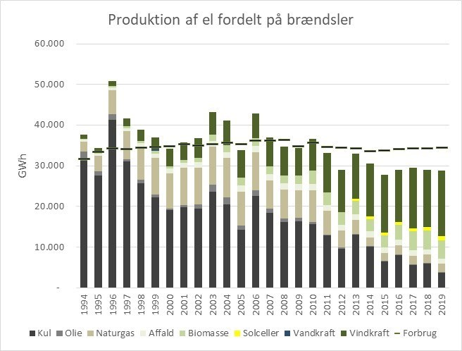Figure 1. Shows total Danish production broken down by fuel and looks exclusively at annual