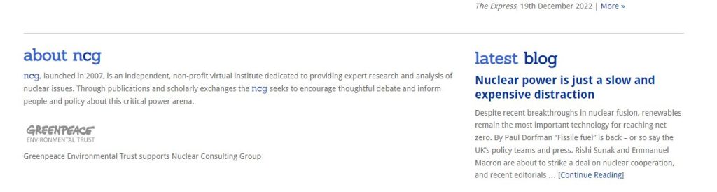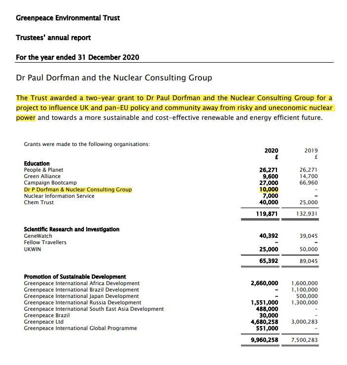 In 2020, Dr. received Paul Dorfman and the Nuclear consulting group £10,000 from the Greenpeace Environmental Trust to influence UK and pan-EU policy away from nuclear power [4].